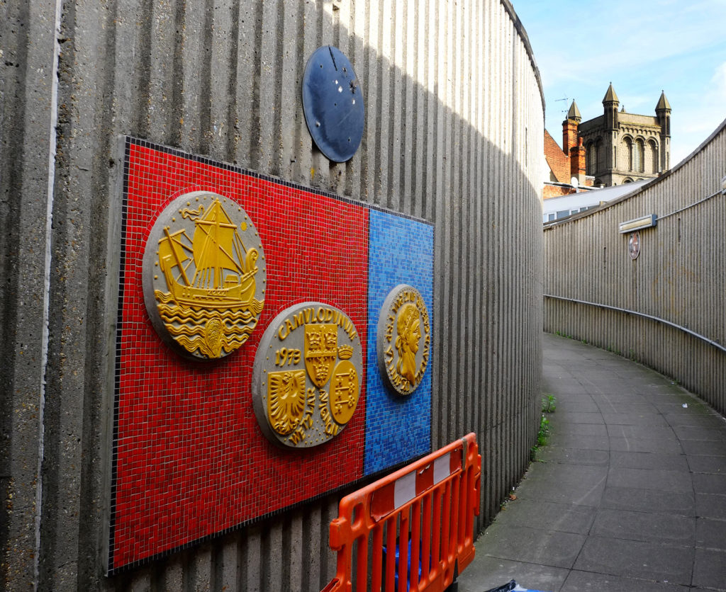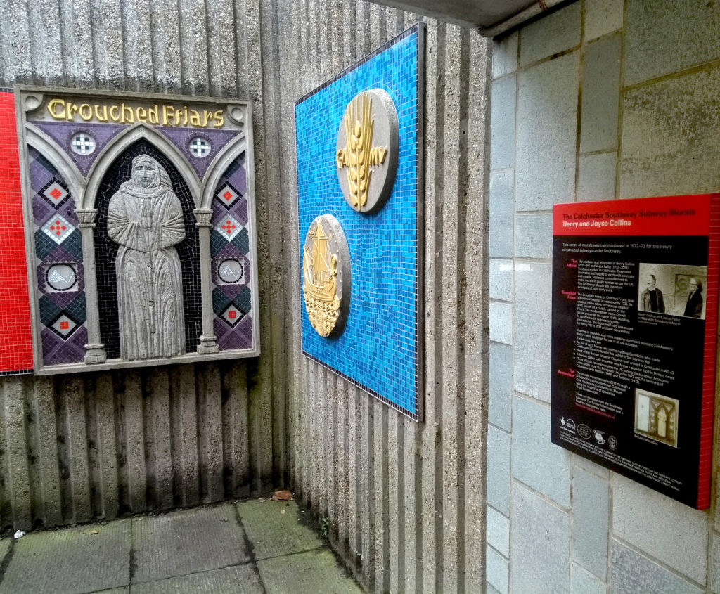 Colchester Civic Society in collaboration with Colchester in Bloom began fundraising in 2014 in order to restore the series of concrete murals produced by husband and wife team Henry Collins and Joyce Pallot, which were installed in Colchester’s Southway Subways in 1973 -1974.